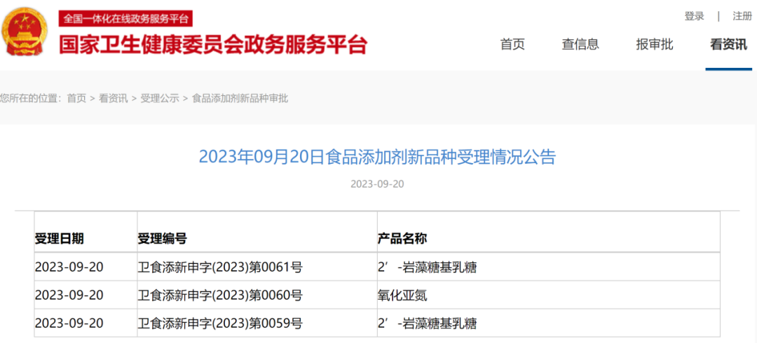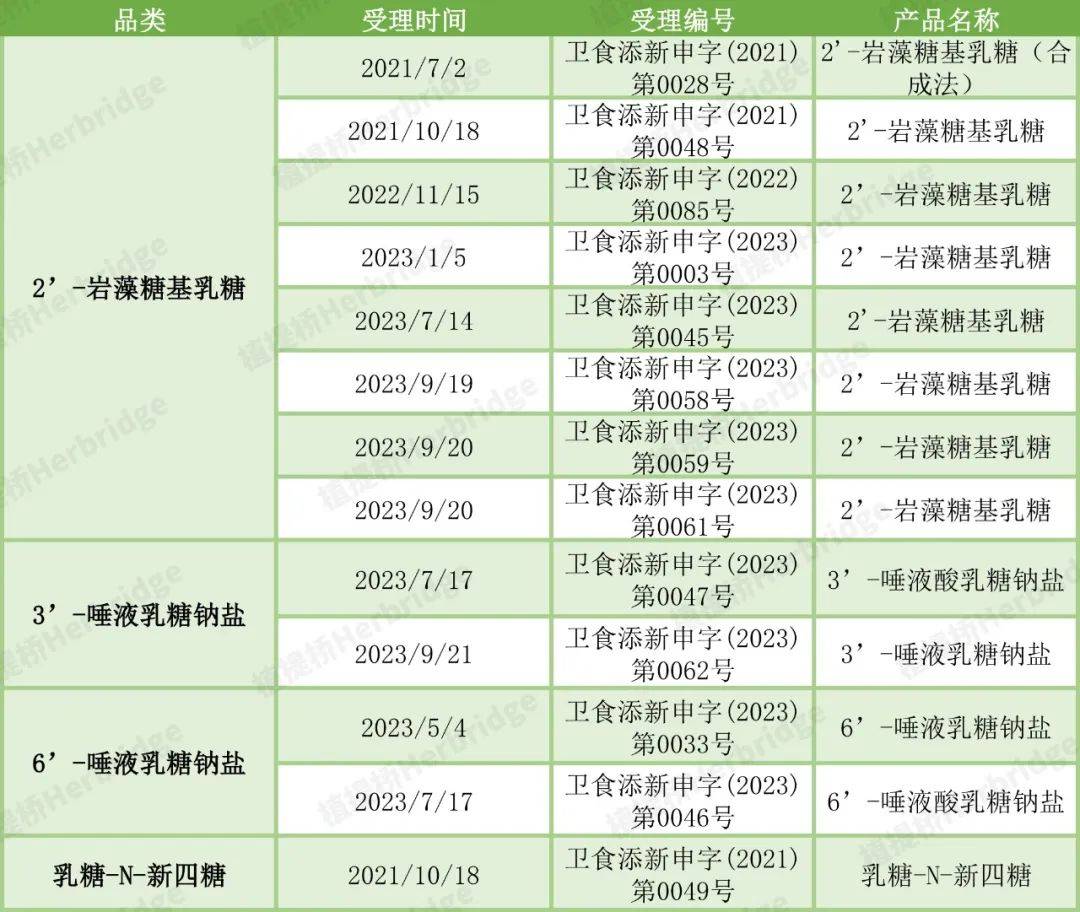 9月19日、20日,21日,国家卫健委再次受理了4款HMOs系列成分,包括3个2'-岩藻糖基乳糖和1个3’-唾液乳糖钠盐。HMOs是今年企业申报的热点。