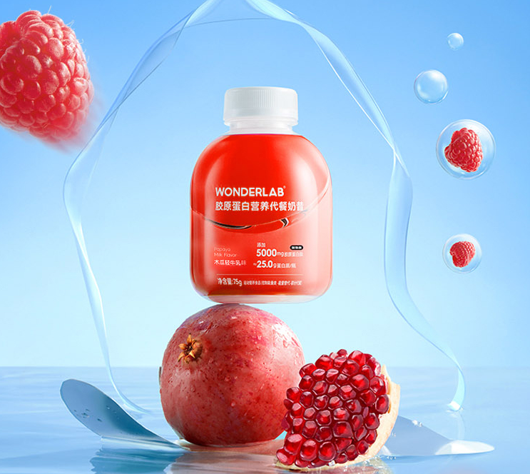 在提供身体所需营养的同时,代餐粉也在能否带来正餐“满足感”上不断内卷。wonderLab的营养代餐奶昔产品为消费者提供12种口味选择,兼顾咸甜和花果风味,并加入冻干颗粒丰富口感。此外,还通过添加胶原蛋白肽营造差异化,收获不少女性用户喜爱。