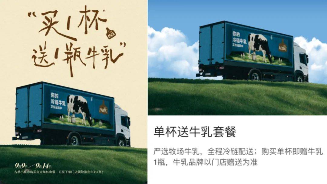 随后,古茗官方小红书账号发布“买一杯送一瓶”活动:9月9日-9月14日,全国9000多家门店上线“单杯送牛奶套餐”,购买指定套餐即可赠送一瓶冷藏牛乳。