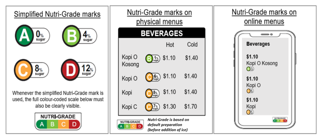 菜单上使用的简化版Nutri Grade,图片来源:Ministry of health