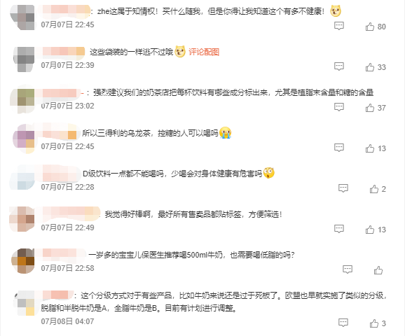 不过,这项制度仅以糖分和饱和脂肪含量作为评估标准,并未纳入蛋白质、矿物质等其他营养成分。有网友发现,市面上部分纯奶产品的营养等级竟然低于果汁、汽水,也引发一些质疑。有网友指出,该分级制度确实有助于筛选产品,但针对不同品类的产品,还需要进一步优化分级方式。