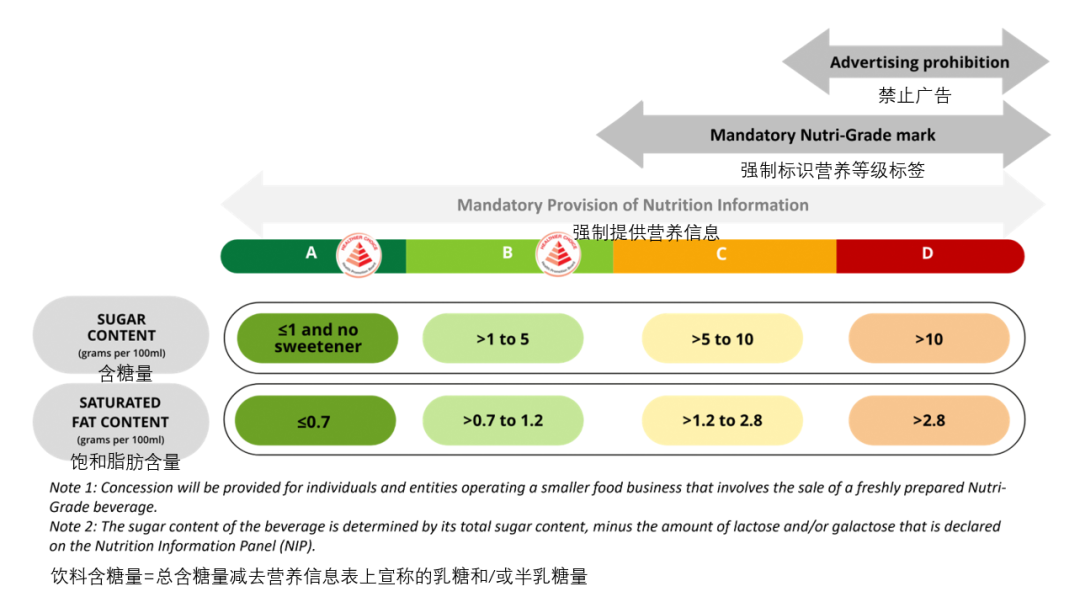 被列为C级、D级的营养级饮料必须在包装正面贴上Nutri-Grade标签,A级、B级的营养级饮料则可以选择是否贴上标签。其中,D级饮料不得在所有媒体平台上做广告宣传。