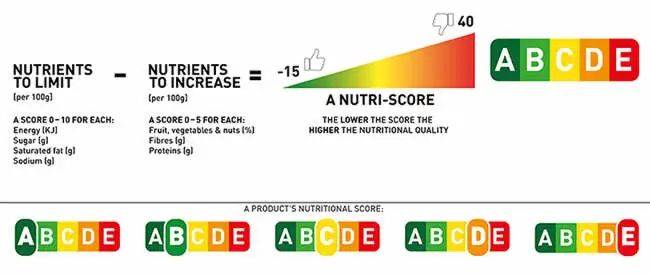 在欧洲大陆市场,Nutri -Score标签是使用较为普遍的营养评级标签。Nutri -Score是一种五色营养标签,基于英国食品标准局(FSA)创建的FSA营养评分,通过将不同营养成分进行赋分和计算,最后得出产品分数对应的等级。