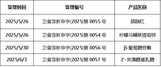 2025年5月26日-6月3日,多款“三新原料”的申报被受理,青钱柳叶提取物、2'-FL、柠檬马鞭草提取物、β- 葡萄糖苷酶、胭脂红等。