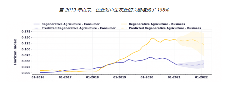 许多大公司开始采用再生农业的模式来对土壤进行可持续的管理,据Spoonshot数据统计,自2019年以来,企业对于再生农业的兴趣增加了138%。