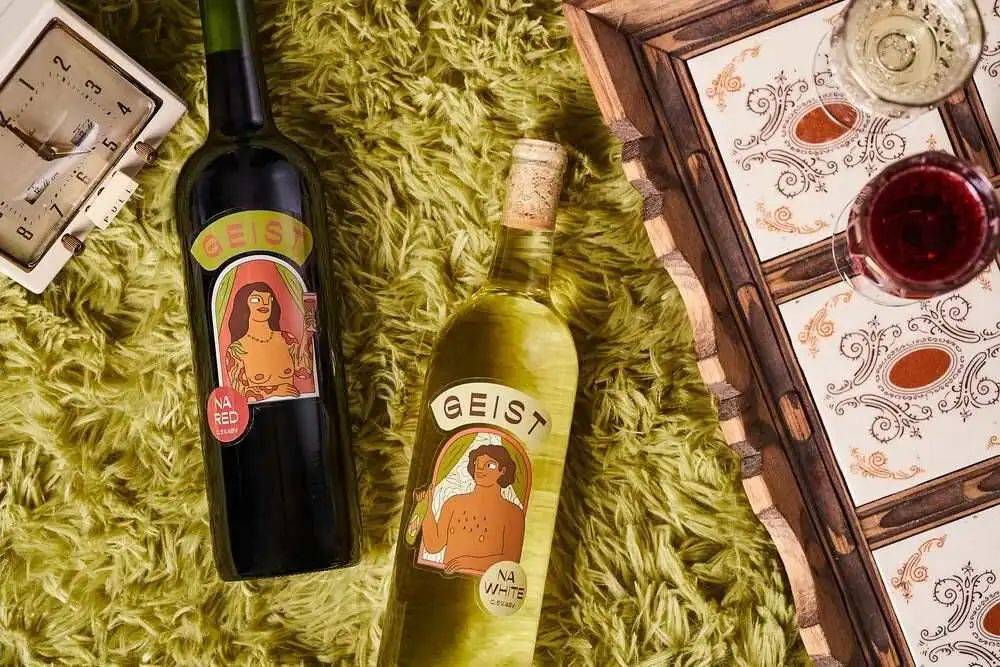 非酒精葡萄酒品牌Geist Wine的新包装也展现了这种审美风格,它在瓶身用蔑视世俗、颇具反叛意味的配图设计,搭配70 年代风格的复古色调,强调了品牌打破常规的风格,也籍此向消费者证明俏皮和精致可以并存。