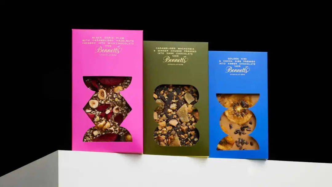 Bennetts Chocolatier是新西兰一家首屈一指的手工巧克力品牌,它的巧克力盒就靠着几何图案形成的视窗,成为甜点界精美视觉的代表。这些视窗不仅让消费者能看到产品内容物,还转变为动态的设计元素,使产品与视窗形状融为一体,互相衬托。