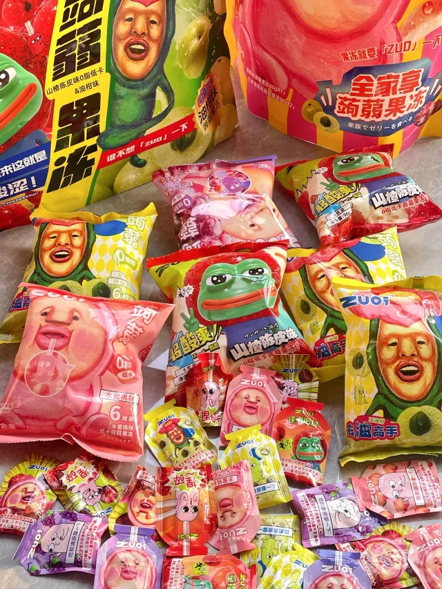 在国内,新锐品牌ZUO一下的包装也颇有这种怪诞风格。他们推出的蒟蒻果冻包装上,画有一张怪异且“不太入眼”的人脸图案,与果冻本身的美好、甜蜜形象形成极大的反差感。但其实,这种风格最近在网络上也颇有热度,网友将它定义为“丑萌”,除了ZUO一下,还有许多“丑东西”同样因为别具一格的风格受到消费喜爱。