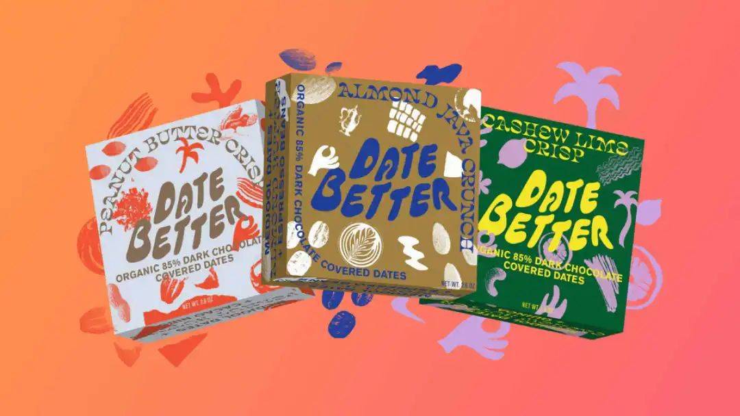 椰枣零食品牌Date Better 的包装就融入了60 年代意大利室内设计风格,以及一些手工刻字和插图,包装给人一种朴实的“手工”感。此外,Date Better 的徽标、图形和版式也带有一丝旧世界的魅力,大胆的颜色搭配让品牌名更加突出。