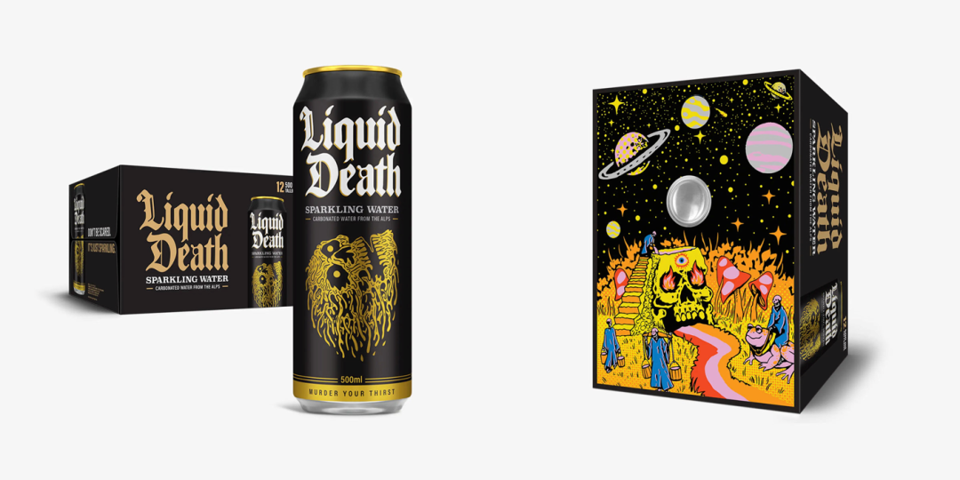 瓶装水品牌Liquid Death就是一个典型的反向营销品牌,旨在通过提供铝罐替代品来消除世界上的一次性塑料水瓶。他们的铝罐产品与传统品牌截然不同,在设计上将重音乐、讽刺、艺术、荒诞幽默、喜剧小品等有趣的元素融合。罐身上充满了重金属、朋克等“重口味”视觉元素,包装底部还藏有一副相同风格的插画。如今,骷髅头成为该品牌的标志性图案。