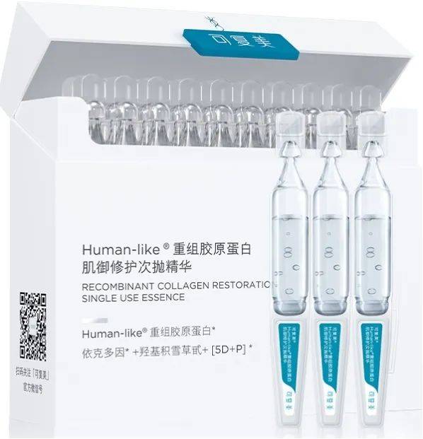 国内重组胶原蛋白行业龙头企业-巨子生物,在旗下品牌可复美推出“可复美胶原棒”,为首款重组胶原蛋白高浓缩修护次抛精华。据品牌介绍,产品核心成分为由四种不同类型重组胶原蛋白科学配比而成的Human-like 重组胶原蛋白C5HR仿生组合,具有良好的肌肤修护功效。外御+内补+芯原力三层维度源源不断为肌肤补充胶原力,深层修护受损屏障,尤其适合敏感肌及需要舒缓修护的肌肤。