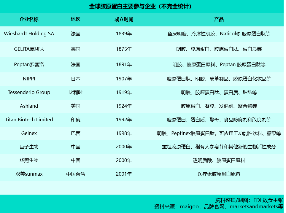 数食主张观察到,目前胶原蛋白的行业巨头主要集中在胶原蛋白原料、医疗健康用胶原蛋白产品、美容护肤类胶原蛋白产品和胶原蛋白食品四大领域。处于行业上游的原料端,孕育了众多实力雄厚,技术超前的龙头企业。