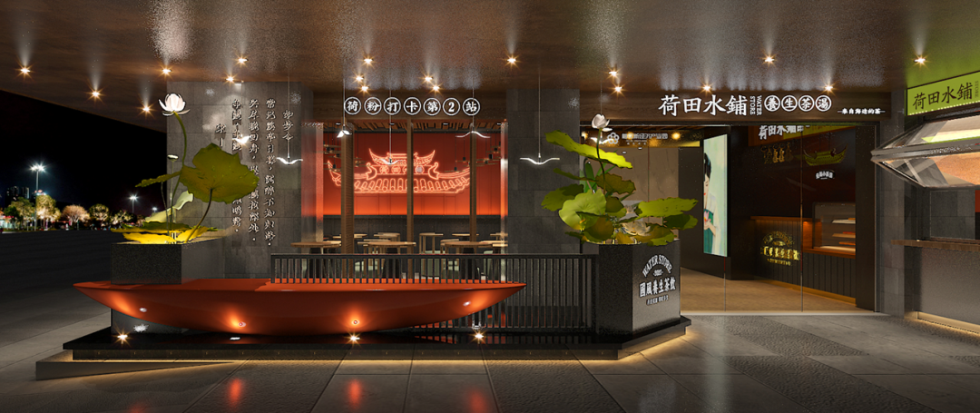门店设计则紧密围绕“国风”展开。品牌名中的“荷田”二字,代表了放松惬意喝茶的情境,同时让用户产生文化联想。