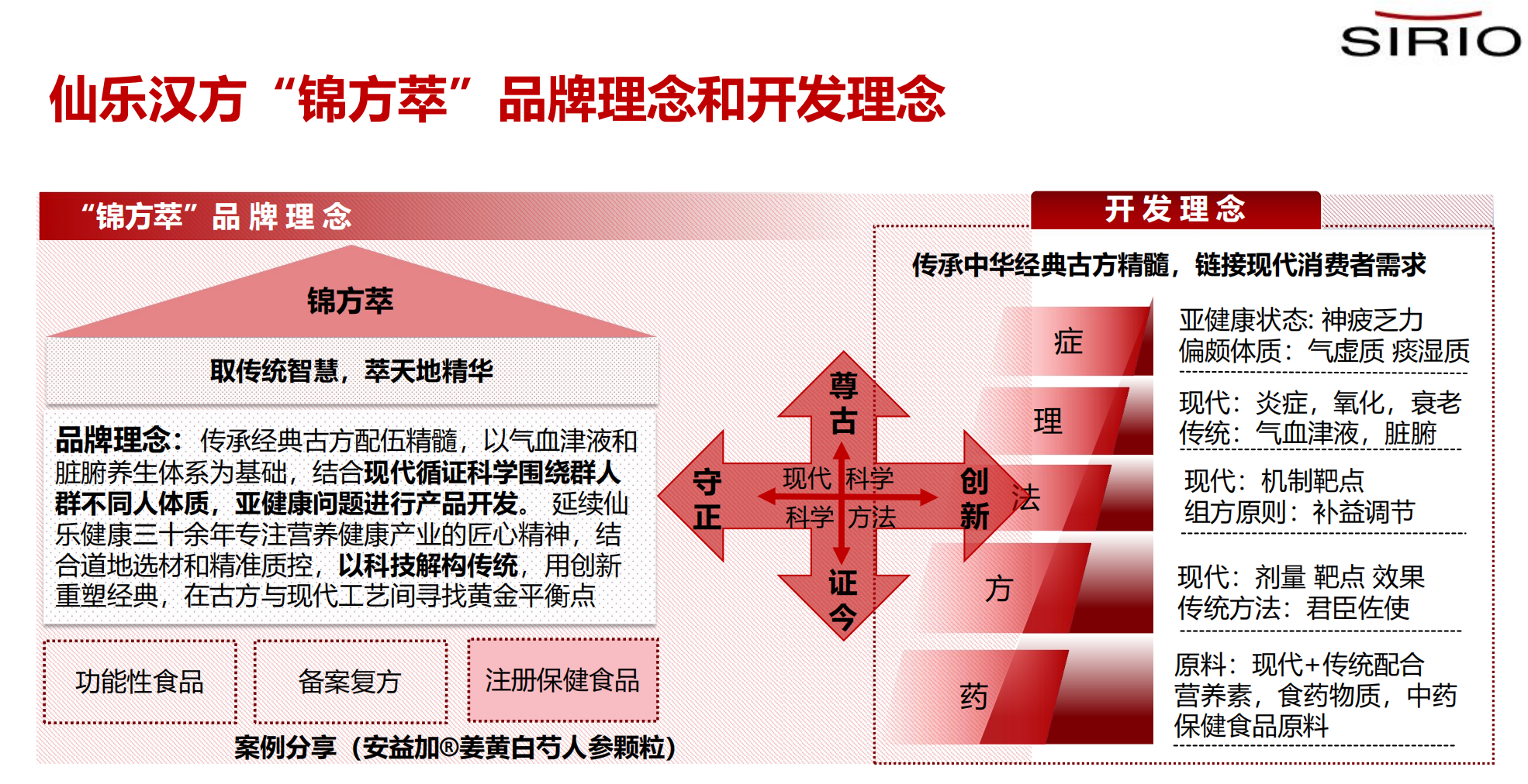 锦方萃的开发理念为“传承中华经典古方精髓,链接现代消费者需求”,通过症、理、法、方、药的逻辑进行产品创新。症即亚健康的状态,理、法、方、药即从整个中医或者传统养生角度如何去解决症的问题,“理、法”从现代角度更多的理解为机制、靶点,从中医角度理解为五脏六腑的气血津液平衡调节;“方”为解决方案,即君臣佐使组方;药为原料,即营养素、食药物质、中药、保健食品原料等。