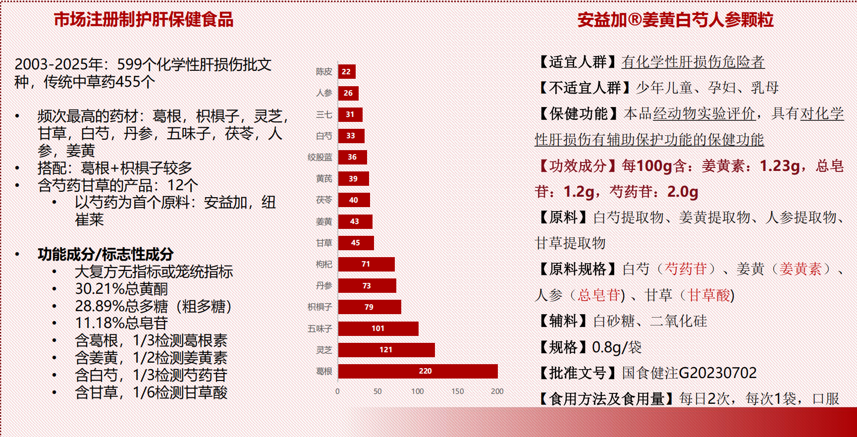 根据卫生部的数据,在2003-2025年间,我国共获批599个化学性肝损伤类保健食品批文,其中传统中草药原料占比达76%,葛根、枳椇子、灵芝、甘草、白芍等是高频使用药材。但现有产品普遍存在组方指标笼统30.21%的产品仅标注总黄酮,28.89%标注总多糖,部分含葛根、姜黄、白芍的产品检测对应活性成分不足。有效成分物质基础和循证仍需要更加深入研究。