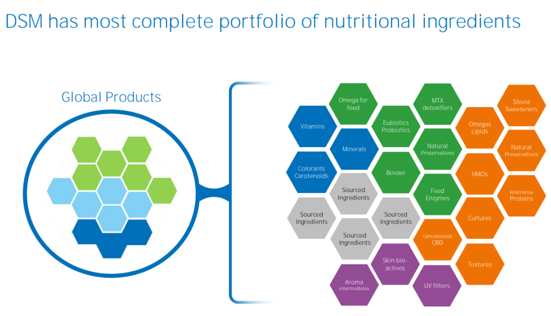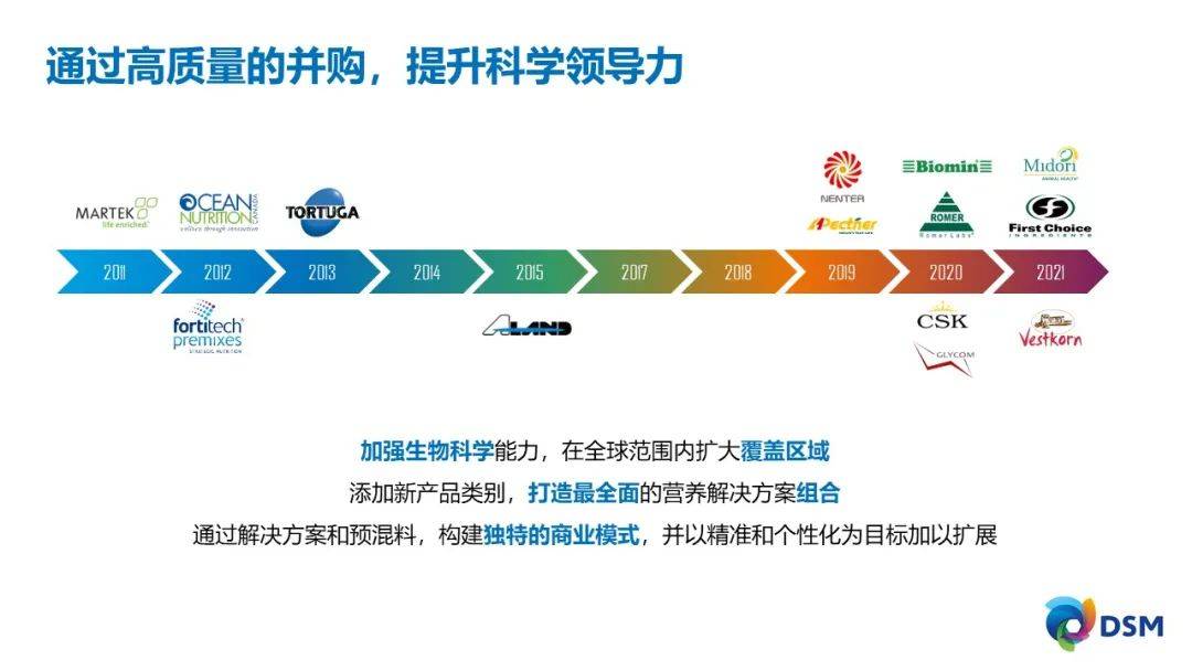 一系列企业收购极大加强了帝斯曼在全球营养、健康和生物科学领域上的领导地位,新增加的产品种类助力打造最全面的营养成分组合,加强了生物科学能力并扩大其全球影响力,使公司在应对快速增长且极具吸引力的营养健康、肠道健康、个性化营养、乳制品等市场上处于有利地位,不断满足公司的财务和战略要求。