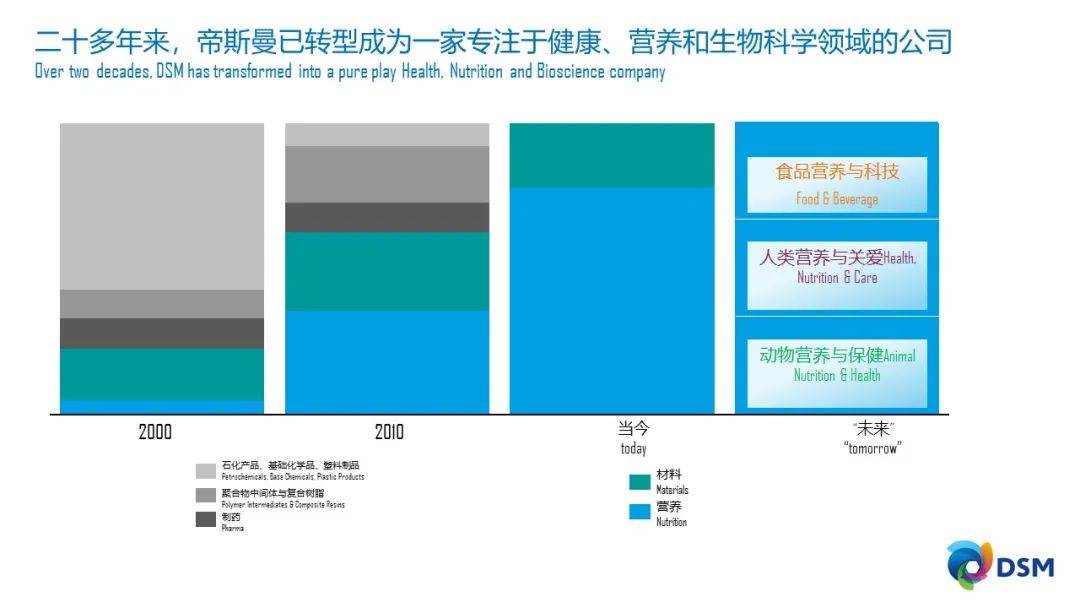 正是帝斯曼前瞻性地布局了化工业务,才让它在煤炭业务关闭的情况下得以延续,在危机来临时保有生机。只是那时的帝斯曼一定没有想到当初的布局会给今后带来怎样脱胎换骨的改变。