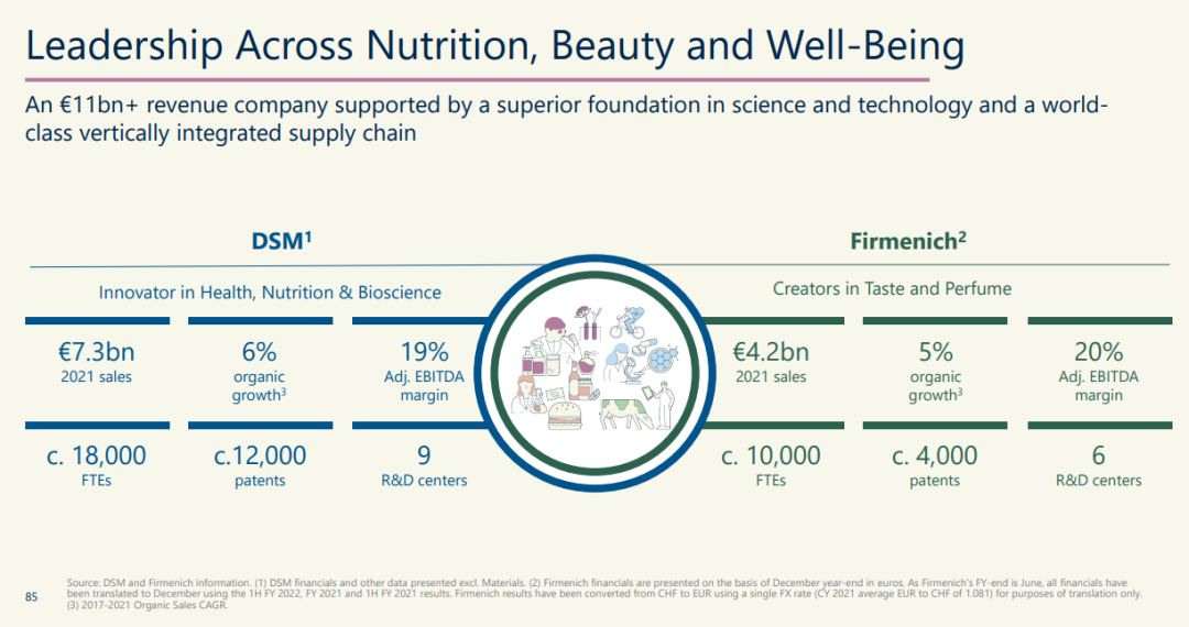 2022年5月31日,帝斯曼与世界最大的香精香料公司芬美意宣布达成商业合并协议(BCA)。在双方2022年6月13日发布的对投资者介绍中介绍到:新成立的公司将会收入超过110亿欧元,卓越的科技基础和世界级的垂直整合供应链,将会造就它在营养、美丽和健康领域的领导力。
