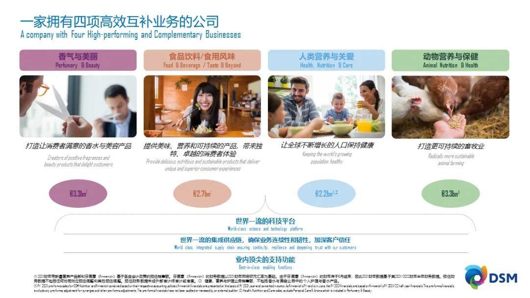 香气与美丽业务主要从事积极香氛、美容产品及全球香原料生产业务;食品饮料/食用风味业务将会为客户提供美味、营养和可持续的产品,提供独特和卓越的消费者体验;人类营养与关爱业务力求维护全球人口健康;动物营养与保健业务让畜牧业从根本上具有可持续性,以更好地为不断增长的全球人口提供重要的蛋白质。帝斯曼-芬美意(DSM-Firmenich)世界级水平的科学技术平台、垂直整合、确保供应连续性&弹性的供应链、一流的支持功能将会加深客户的信任。