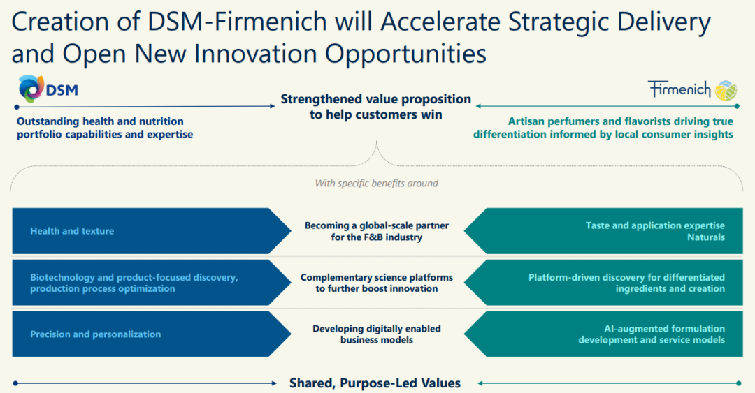 合并后,帝斯曼-芬美意将形成一个新的全球性合作伙伴,服务于食品和饮料行业,将帝斯曼的食品营养与科技业务同芬美意的食用风味业务相结合,芬美意领先的全球香水和配料业务将通过帝斯曼的个人护理及香原料业务进一步扩展到香气与美丽领域。帝斯曼的人类营养与关爱和动物营养与保健业务将加入这些新的合并业务。除此以外,帝斯曼以生物技术和产品为中心的发明、生产过程优化同芬美意平台驱动的差异化成分发现和创造,能进一步推动科学平台的创新,帝斯曼的精准和个性化技术同芬美意的人工智能增强配方开发和服务模型有利于共同开发数字化商业模式。