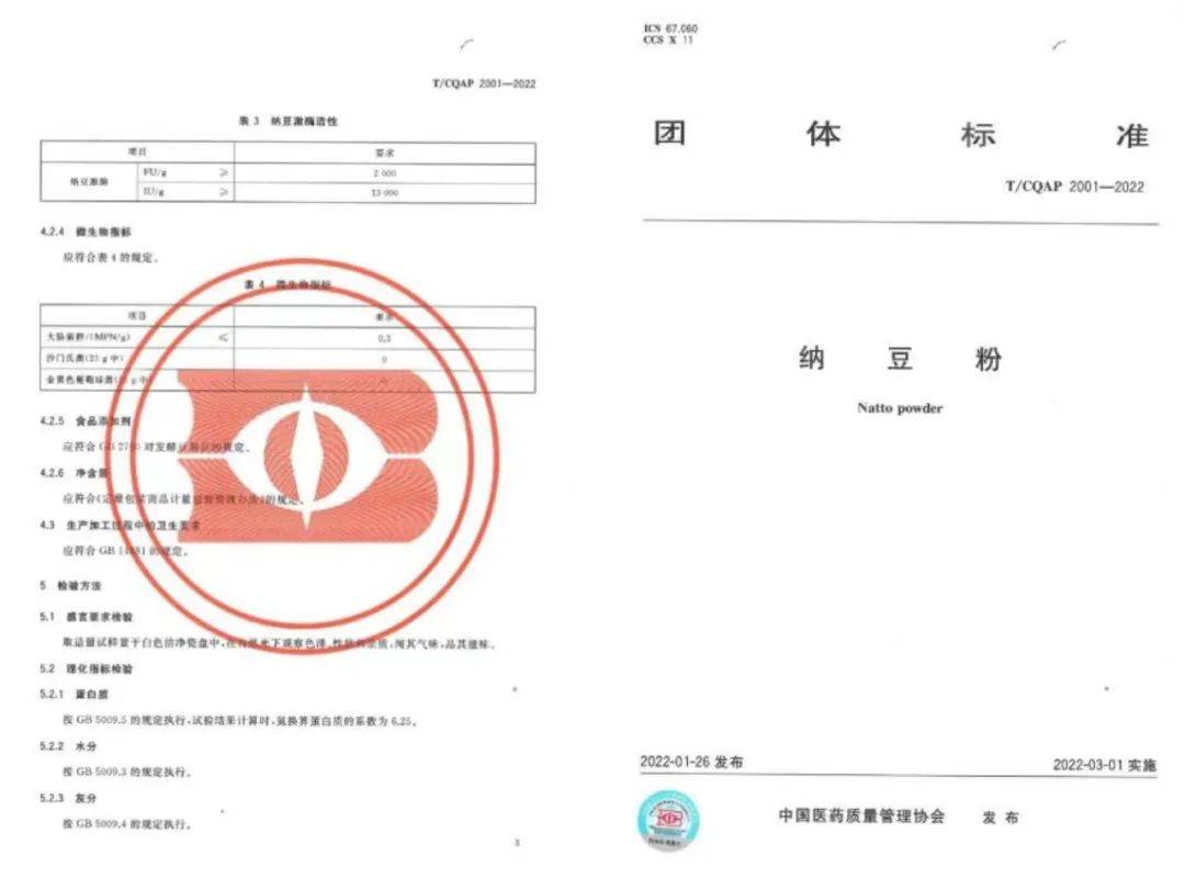 2022年1月15日,由中国医药质量管理协会、广东双骏生物科技有限公司牵头,联合北京中医药大学、沈阳药科大学等15家科研院所和企业参与起草的T/CQAP 2001—2022《纳豆粉》团体标准在全国团体标准信息平台发布,并于2022年3月1日起正式实施。