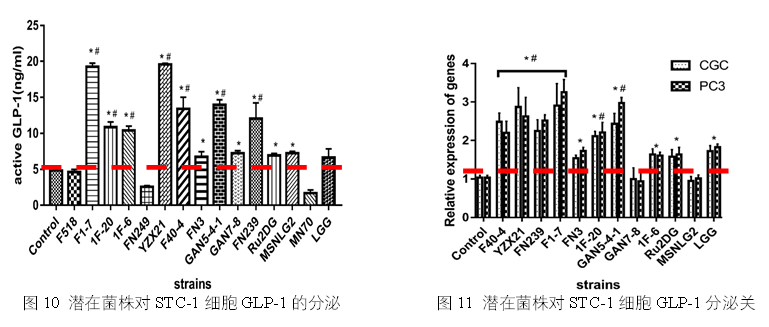 构建STC-1细胞,测定益生菌调节GLP-1的能力。动物双歧杆菌F1-7 组的 GLP-1 分泌量非常高,为19.66±0.18ng/ml 效果较为突出;且对GCG 和 PC3 基因表达影响显著,上调倍数均超过 2倍,高于其他各组!