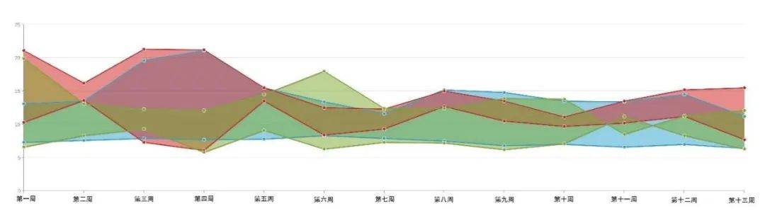 上图蓝色区域为受试者早餐前后的血糖值,红色区域为午餐前后血糖变化,绿色区域为晚餐前后的血糖变化区间。每周色块区域高度越小,表明血糖值变动越小;