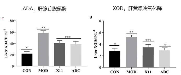 对照组(CON)、模型组(MOD)、益生菌组(X11)、活性药物对照组(ADC,别嘌醇,治疗痛风的主要用药)。