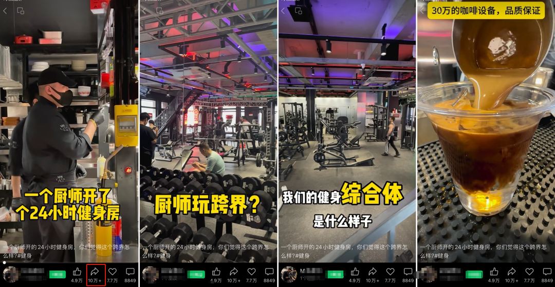我注意到,微信视频号上“一个厨师开的24小时健身房”的视频也火了,转发量超过10万,这家店集咖啡、健身和餐厅于一身,受到网友追捧。