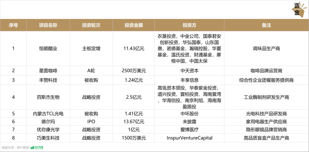 据不完全统计,5月共发生投融资事件48起,融资金额为51.47亿元。其中,人民币交易总额(含港币)48.33亿人民币;美金交易总额约为4400万美元(本数据仅统计中国境内人民币及美元投资额,当日汇率比为1:7.1299)。 在融资事件数量上,相比4月份的40起,5月份消费领域环比增长20%;但在总融资金额上,因小额投资事件较多,相较4月份的164.42亿元,5月份消费领域下降幅度为68.7%,仅为51.47亿元。 每月投融资事件数(近6个月) 02 从投资机构看 据统计数据显示,5月份消费领域共有75个机构参与投资(不含未披露机构),与4月份相比增幅明显。此外,本月并未出现多次出手的投资机构。 03 从融资轮次看 本月新消费品牌融资主要集中在天使轮、A轮与股权投融资。 其中天使轮及种子轮融资事件达11起,A轮(含Pre-A及A+轮)融资达13起,占比50%,早期轮次所占比例与往月基本一致,主要集中在食品饮料与电商零售领域。 股权投融资事件9起,占比18.75%,与往月持平,多分布在食品饮料与电商零售领域,如柠檬茶品牌「LemonRepublic」、儿童健康餐食品牌「怡芽YUMMYKIDS」等。 值得注意的是,新消费领域中天使轮获融资金额一般为百万元级别,本月有多家天使轮即获得千万级的公司,如休闲零食品牌「豆果原香」、功能性食品研发商「醒狮东方」等。 5月消费领域融资轮次分布图 04 从融资领域分布看 本月主流赛道为食品饮料、电商零售与消费科技,占比分别为43.75%(21起)、18.75%(9起)和12.5%(6起)。结合上月融资数据来看,食品饮料事件数与上月持平,电商零售与消费科技赛道受到了更多资本关注。 5月消费投融资细分领域分布图 宠物经济热度不减,拟人化服务兴起 随着行业发展,宠物消费逐渐往精细化、专业化、高端化方向发展,涵盖宠物衣食住行、生老病死全产业链。继上月的2起投融资事件后,本月的宠物赛道再度斩获4笔投资,屡获资方关注,宠物经济热度不减。 从兽用疫苗开发商「爱宠生物」、宠物原研新药及仿制药研发生产商「润宠生物」、到智能宠物生活方式品牌「PAWKA泡咔」、宠物拟人化服务品牌「小宠科技」,4笔融资轮次均分布在天使轮及股权投资轮次。在高增长市场潜力的吸引下,宠物赛道进入了更大规模的扩张和成长阶段。 据《艾媒咨询|2022-2023年中国宠物产业发展及消费者调研研究报告》显示,在宠物行业的需求端、供给端以及资本的共同推动下,中国宠物经济产业规模增长迅速,预计2025年市场规模将达8114亿元。 中国宠物市场潜力巨大,人们的养宠认知经历了从粗犷到精细化养护的转变,这必然会带来宠物行业几何式的增长。在“铲屎官”眼里,宠物不单单是普通动物,而是家人、朋友甚至伴侣,人们将陪伴依赖和情感寄托注入宠物。宠物的拟人化服务属性增强,全生命周期覆盖的细分领域也日趋成熟。 宠物减肥、美容、行为矫正、心理治疗、殡葬…… 除基本的“吃、喝、玩、乐”外,人类有的生活服务需求也统统腾挪给宠物。宠物拟人化服务品牌「小宠科技」今年探索的宠尔顿宠物乐园就定位为“城市近郊宠物迪士尼”,服务涵盖宠物游玩、游泳、美容、寄养服务。 随着行业发展步入提速期,在可预见的未来里,宠物拟人化概念或将迎来持续性扩张,对应人类生活“衣食住行”的宠物新消费品牌也将迎来更多发展机遇。 近两月宠物类品牌投融资实况 精细化需求,催生营养健康新机遇 “四方食事,不过一碗人间烟火”,现代人对“吃”得健康与否愈发上心。受健康意识觉醒、消费升级、膳食结构改善、老龄化加剧等因素的影响,中国营养健康食品市场始终保持高速增长,且功能不断新增、需求更精细化…… 其中,本月有4个针对营养健康领域的食饮品牌收获了资方青睐:健康食品生产商「MOODLES」获Pre-A+轮投资,孕妇专属膳食品牌「孕味食足」获数千万元A+轮投资、儿童健康餐食品牌「怡芽YUMMYKIDS」获数千万元股权投资,传统养生食疗文化品牌「百养方」获2000万元天使轮融资。 据亿欧智库所发布《2022年轻人膳食养生报告》显示,2021年中国膳食养生市场规模超过5000亿元,近十年复合增长率超9%。当前人群规模达2.8亿人,平均渗透率为20%。基数更大、消费意愿更强的年轻人群展现出了极大的增长潜力。 精细化需求下,营养健康食品的品类、人群均在细分。养生的“潮风”吹向年轻一代,奶茶饮品也主打健康。于上月获得数千万元A轮投资的新式健康茶饮品牌「萌白白」抓住机会,通过进一步细分健康赛道,在竞争激烈的茶饮市场中占据一席之地。 在中国的饮食文化和“味觉公约数”中,消费者对中医药具有强认知和高价值感。传统养生食疗文化品牌「百养方」将中国经方养生智慧融入到产品中,由中医专家顾问团参与设计了经方汤包、养生茶包、滋补膏方、食疗丸,阿胶糕等养生产品。 此外,针对细分群体的孕妇专属膳食品牌「孕味食足」、儿童健康餐食品牌「怡芽YUMMYKIDS」获得资本青睐,见证着人们对孕妇、儿童等特定人群的营养需求的重视。人口红利消亡,唯有创新与细分才能持续激发消费动能。可以预见,未来营养健康细分市场将会是各类创新机会的集中地。 近两月营养健康类企业投融资实况 05 从单笔融资金额看 从融资金额来看,本月共有8起过亿元投融资(含IPO),主要集中在食品饮料领域。 融资金额过亿的交易公司统计