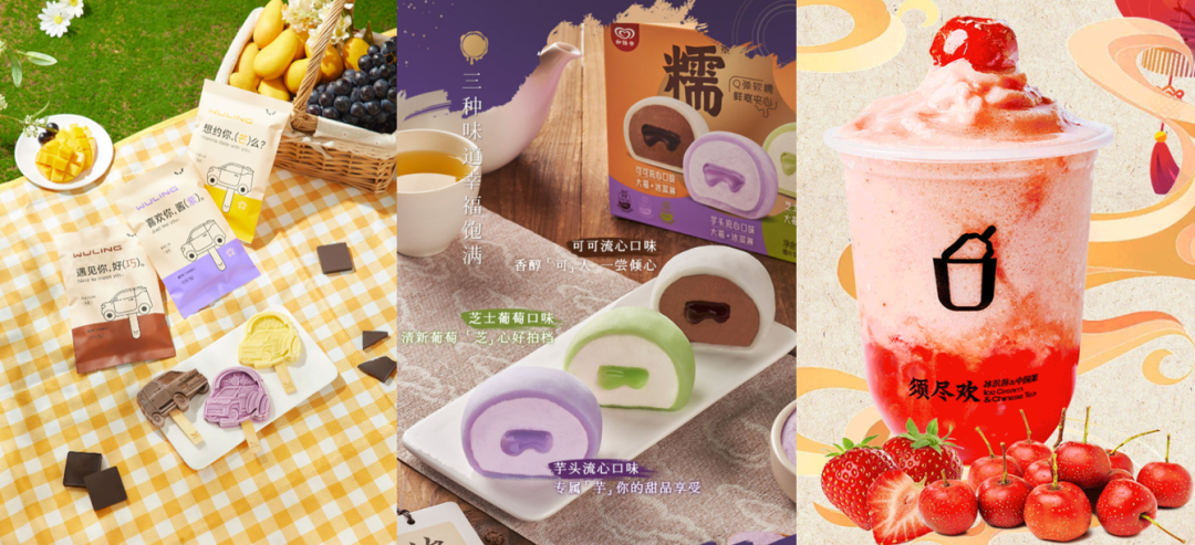 此外,冰淇淋还被赋予了社交情感、文化追求等更多情绪价值,通过融入传统国潮、趣味体验、怀旧记忆等元素都在迎合或塑造大众对冰淇淋品类的消费认知。冰淇淋的消费场景也随着冰淇淋消费属性的变化,从逛街时的冲动型消费拓展到娱乐打卡、社交约会、居家零食、奖励甜品等新的场景中。