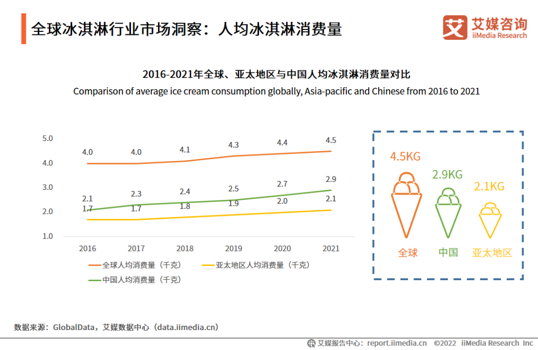 GlobalData数据显示:2021年,我国人均冰淇淋消费量为2.9kg,低于全球人均的4.5kg,更是远远低于美国(人均25.8kg)、日本(人均11kg)等冰淇淋发达市场。中国冰淇淋市场的增长空间依然很大。