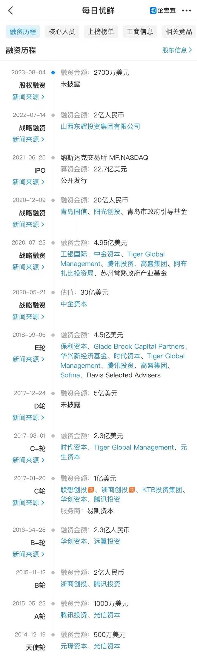 2020年7月,每日优鲜宣布完成新一轮4.95亿美元融资,由中金资本旗下基金领投,工银国际、腾讯、阿布扎比资本集团、苏州常熟政府产业基金、Tiger Global、高盛资产管理旗下基金及其他数家机构联合出资。