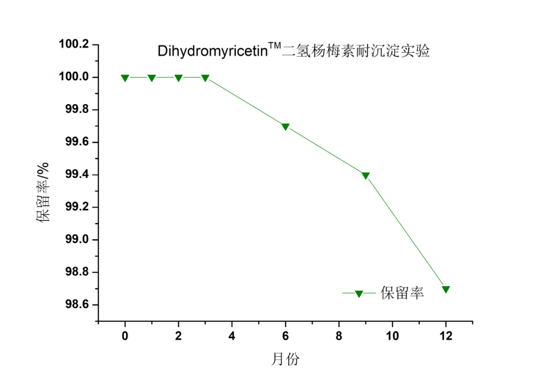高溶解度:Dihydromyricetin TM二氢杨梅素在冷水中的溶解度可达到20mg/mL左右,相比较于原料水溶性提升28.6倍,溶解后溶液呈澄清透亮状态。此外,经过静置沉淀实验显示,Dihydromyricetin TM二氢杨梅素在酸性水溶液中存放12个月保留率在98.9%。高溶解度和不易沉淀能够满足二氢杨梅素饮料货架期稳定需求。