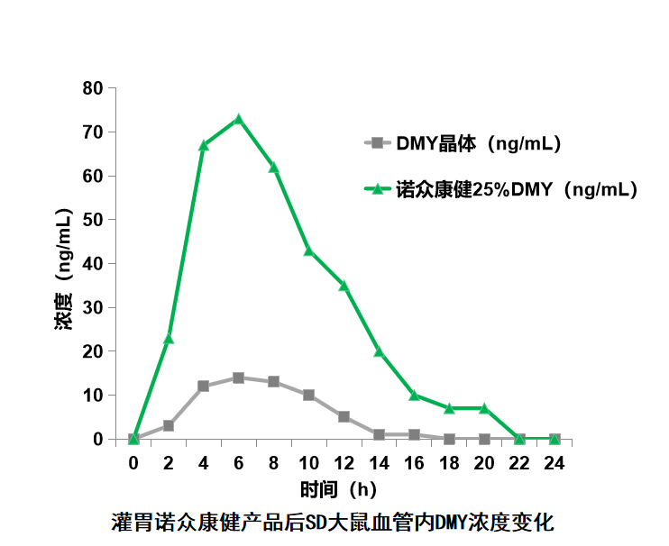 生物利用度差:二氢杨梅素的口服生物利用度较差,只有 4.02%。口服剂量为100 mg/kg 的二氢杨梅素后,大鼠血浆中的Cmax仅为80 ng/m L 左右。