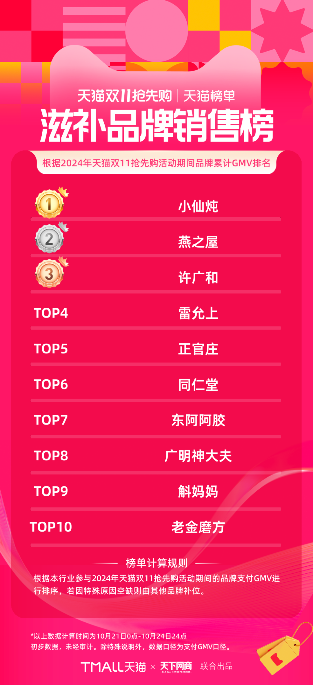 在滋补品牌销售榜,小仙炖、燕之屋和去年一样稳居第一第二,主打产品均为鲜炖燕窝。许广和、雷允上、同仁堂、东阿阿胶等耳熟能详的国货老品牌也深受消费者喜爱,排进了前七。值得关注的是,今年广明神大夫、斛妈妈也进入了前十榜单。