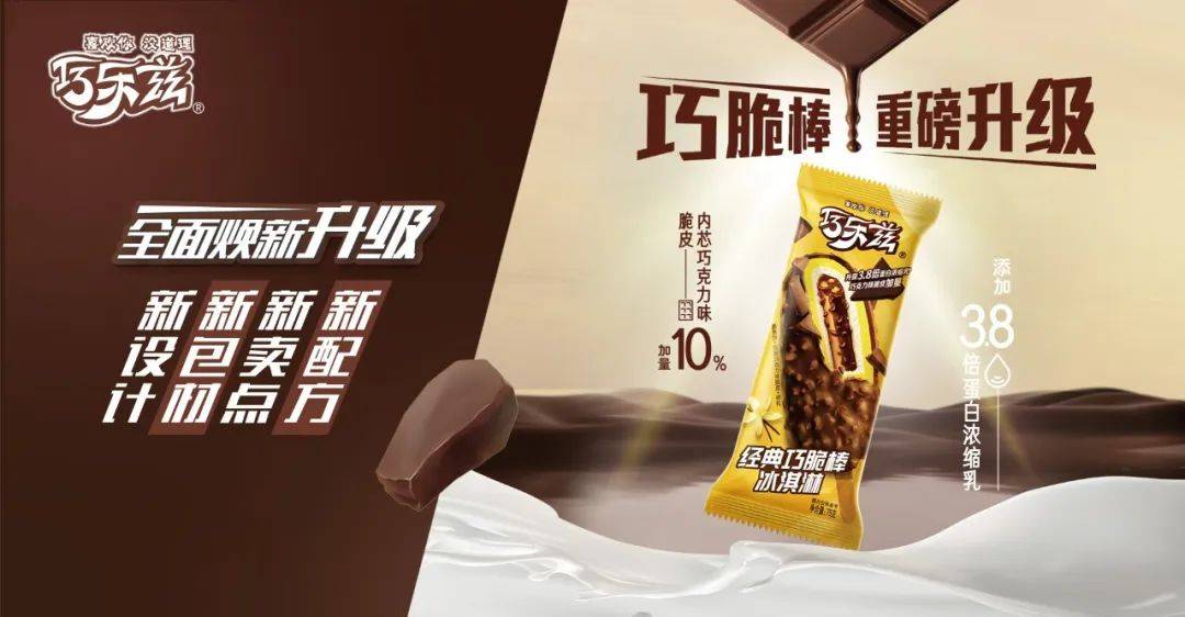 巧脆棒是巧乐兹旗下最受欢迎的畅销单品。2023年5月,巧脆棒荣登“华东地区雪糕/冰淇淋畅销榜”榜首。该产品的标志卖点在于独特的内芯——由脆香饼和巧克力脆棒组成,以“脆”为卖点,融合冰淇淋和巧克力的丝滑,创建多重质构和食用体验。此次升级,对巧克力脆皮加量,在原有的基础上增强层次感,巧克力传递的多重苦甜香气在整体品尝时风味更浓郁,口感更饱满,为味觉添加了一丝惊喜。