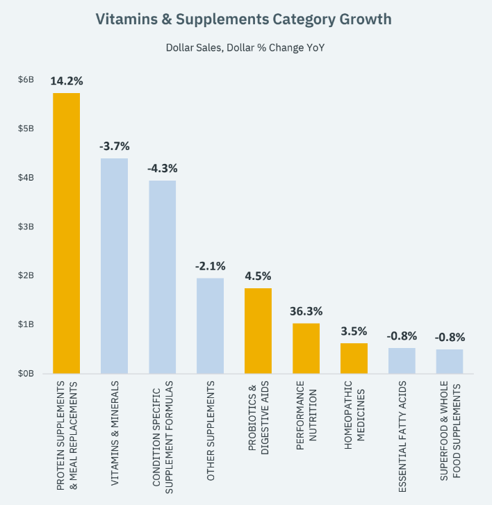 从膳食补充剂品类数据来看,整体市场增长放缓,9个品类中只有4个类别出现增长,分别是蛋白补充剂&代餐、益生菌和消化助剂、性能营养、顺势疗法,其中增长比较明显的是性能营养,高达36.3%,其次是蛋白补充剂和代餐产品,增幅为14.2%。