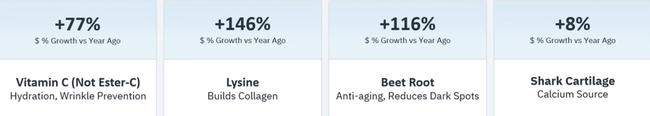 SPINS发布的数据中显示,2023年美国市场增长比较快的4款原料分别是维生素C(非酯化)、赖氨酸、甜菜根和鲨鱼软骨,其中含赖氨酸的产品同比增长高达146%,含甜菜根的产品增幅为116%。