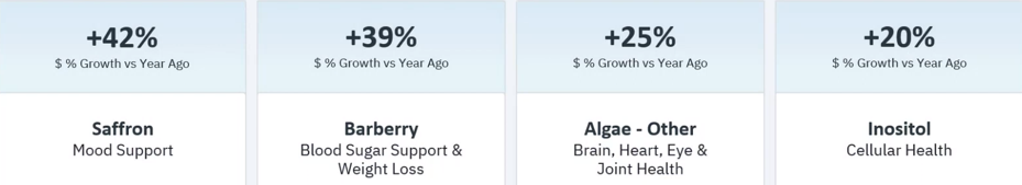 在天然渠道品类中,增长比较快的原料主要是藏红花提取物、小檗浆果、海藻(其它)、肌醇,其中含藏红花的产品同比增长高达42%。