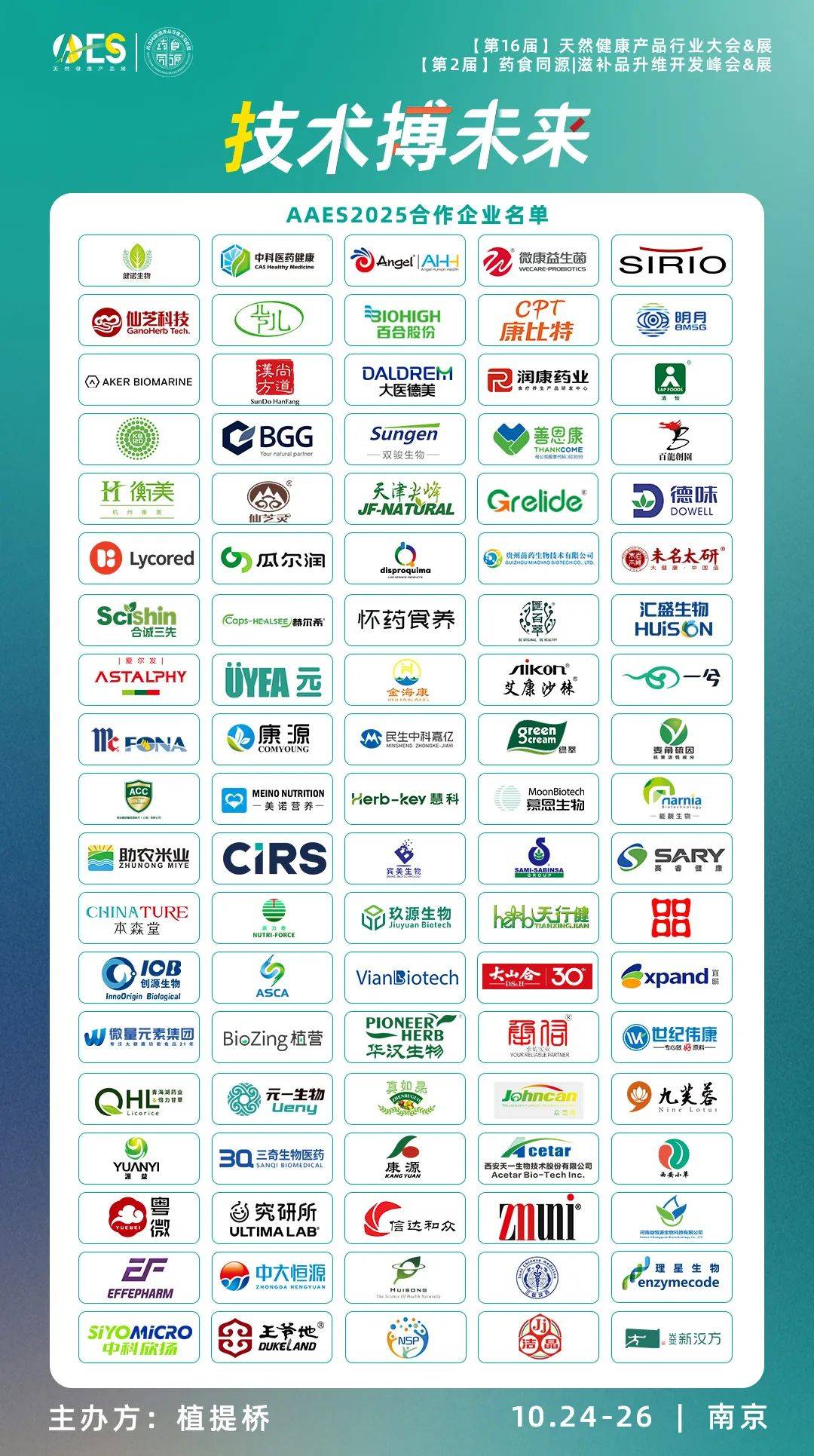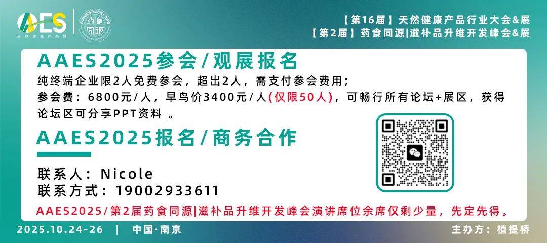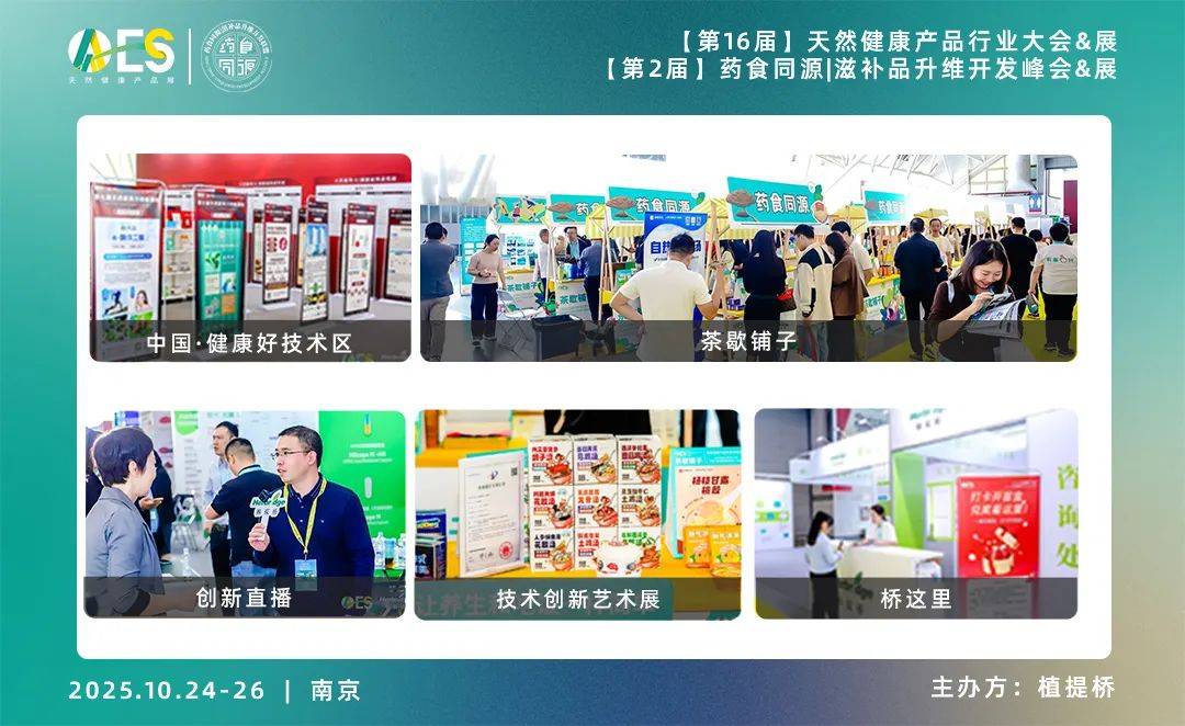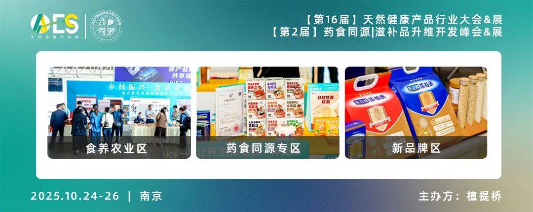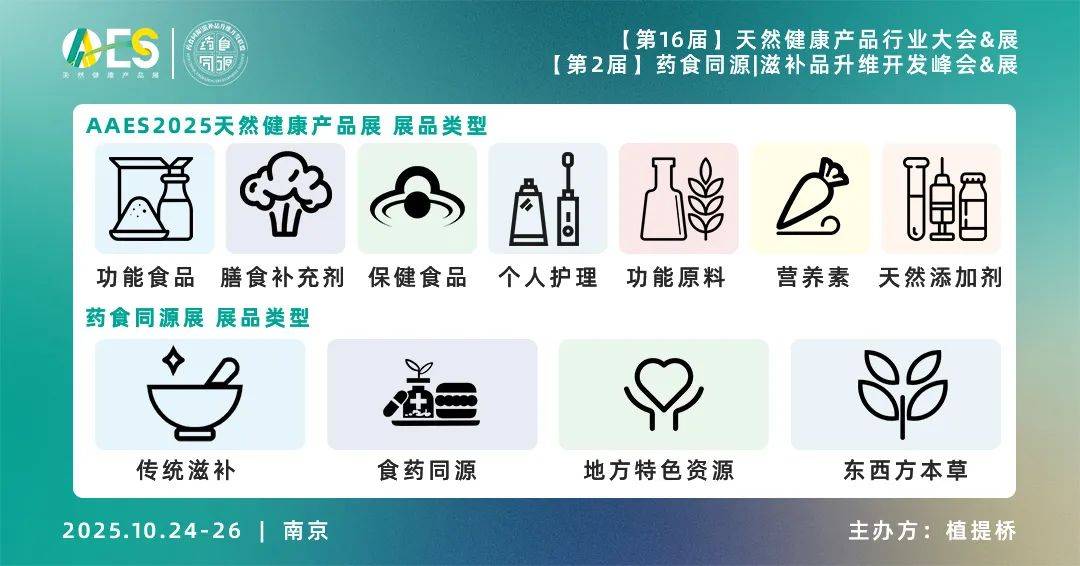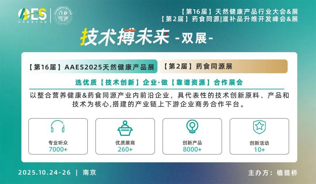 植提桥主办的AAES2025【AAES天然健康产品展&AAES天然健康产品行业大会】及同期会议【第2届药食同源|滋补品升维开发峰会】将于2025年10月24日-26日在南京国际展览中心(新庄)正式举办。