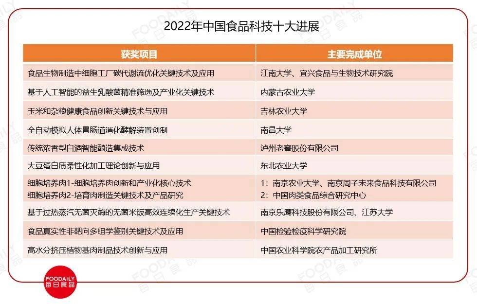 去年12月,中国食品科学技术学会首次颁布2022中国食品科技十大进展。涉及细胞工程、微生物育种、农产品技术创新、肠道健康、酿酒工程、蛋白加工等多个领域。