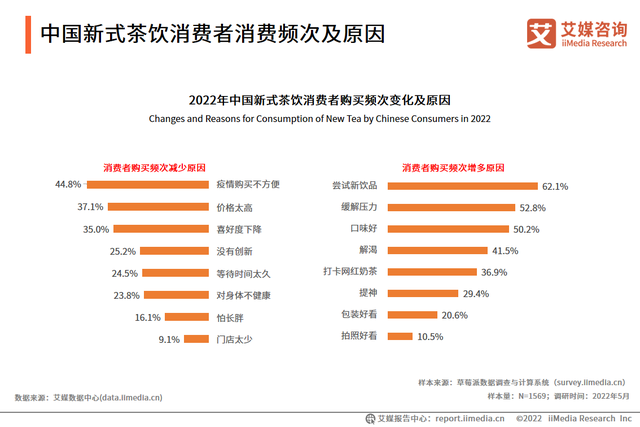看消费端:据iiMedia Research(艾媒咨询)《2022年上半年中国新式茶饮行业发展现状与消费趋势报告》数据显示,新式茶饮主流消费人群为90后与00后年轻消费者,占整体消费者数量近七成。2022年每周消费新式茶饮的消费者占比达94.0%,影响消费频率增加的前三原因分别是:尝试新饮品(62.1%)、缓解压力(52.8%)、口味好(50.2%)。在众多新式茶饮料中,其中具备颜值高、口感清爽,且符合健康饮品的消费理念的“果茶”品类持续受到消费者青睐,56.9%的新式茶饮消费者表示喜欢水果茶系列。
