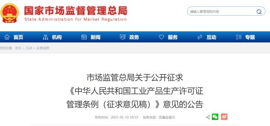 5月19日,市场监管总局组织对《中华人民共和国工业产品生产许可证管理条例》进行修订。现将《中华人民共和国工业产品生产许可证管理条例(征求意见稿)》(简称“条例”)向社会公开征求意见。反馈意见截止日期为2025年6月18日。