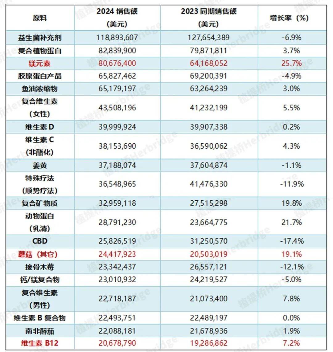 2024年,镁元素、水飞蓟、蛋白质、蘑菇在美国市场热卖。