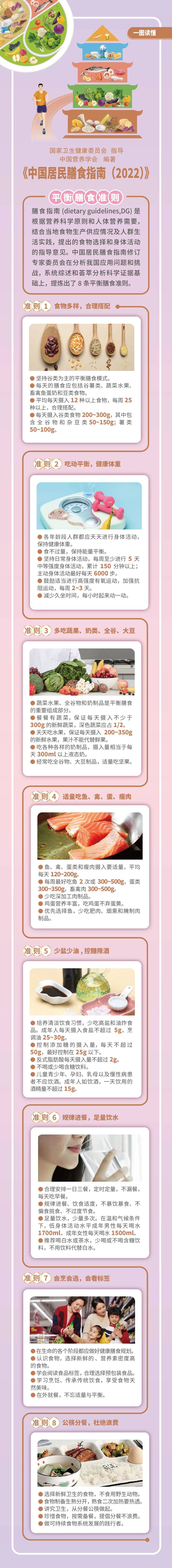 2022年4月26日上午,《中国居民膳食指南(2022)》发布会在京举行。 编者按:膳食指南是健康教育和公共政策的基础性文件,是国家实施《健康中国行动》(2019-2030年)和《国民营养计划》(2017-2030年)的一个重要技术支撑。2022年4月26日上午,《中国居民膳食指南(2022)》发布会在京举行。 《中国居民膳食指南(2022)》提炼出了平衡膳食八准则:一、食物多样,合理搭配;二、吃动平衡,健康体重;三、多吃蔬果、奶类、全谷、大豆;四、适量吃鱼、禽、蛋、瘦肉;五、少盐少油,控糖限酒;六、规律进餐,足量饮水;七、会烹会选,会看标签;八、公筷分餐,杜绝浪费。 《中国居民膳食指南(2022)》组成 《中国居民膳食指南(2022)》包含2岁以上大众膳食指南,以及9个特定人群指南。 为方便百姓应用,还修订完成《中国居民膳食指南(2022)》科普版,帮助百姓做出有益健康的饮食选择和行为改变。 同时还修订完成了中国居民平衡膳食宝塔(2022)、中国居民平衡膳食餐盘(2022)和儿童平衡膳食算盘(2022)等可视化图形,指导大众在日常生活中进行具体实践。 《中国居民膳食指南》沿革 自1989年首次发布《中国居民膳食指南》以来,我国已先后于1997年、2007年、2016年进行了三次修订并发布,在不同时期对指导居民通过平衡膳食改变营养健康状况、预防慢性病、增强健康素质发挥了重要作用。 在国家卫生健康委等有关部门的指导和关心下,中国营养学会组织近百位专家对膳食指南再次进行修订,经过近三年的努力,在对近年来我国居民膳食结构和营养健康状况变化做充分调查的基础上,依据营养科学原理和最新科学证据,结合当前疫情常态化防控和制止餐饮浪费等有关要求,形成《中国居民膳食指南研究报告》,并在此基础上顺利完成《中国居民膳食指南(2022)》。