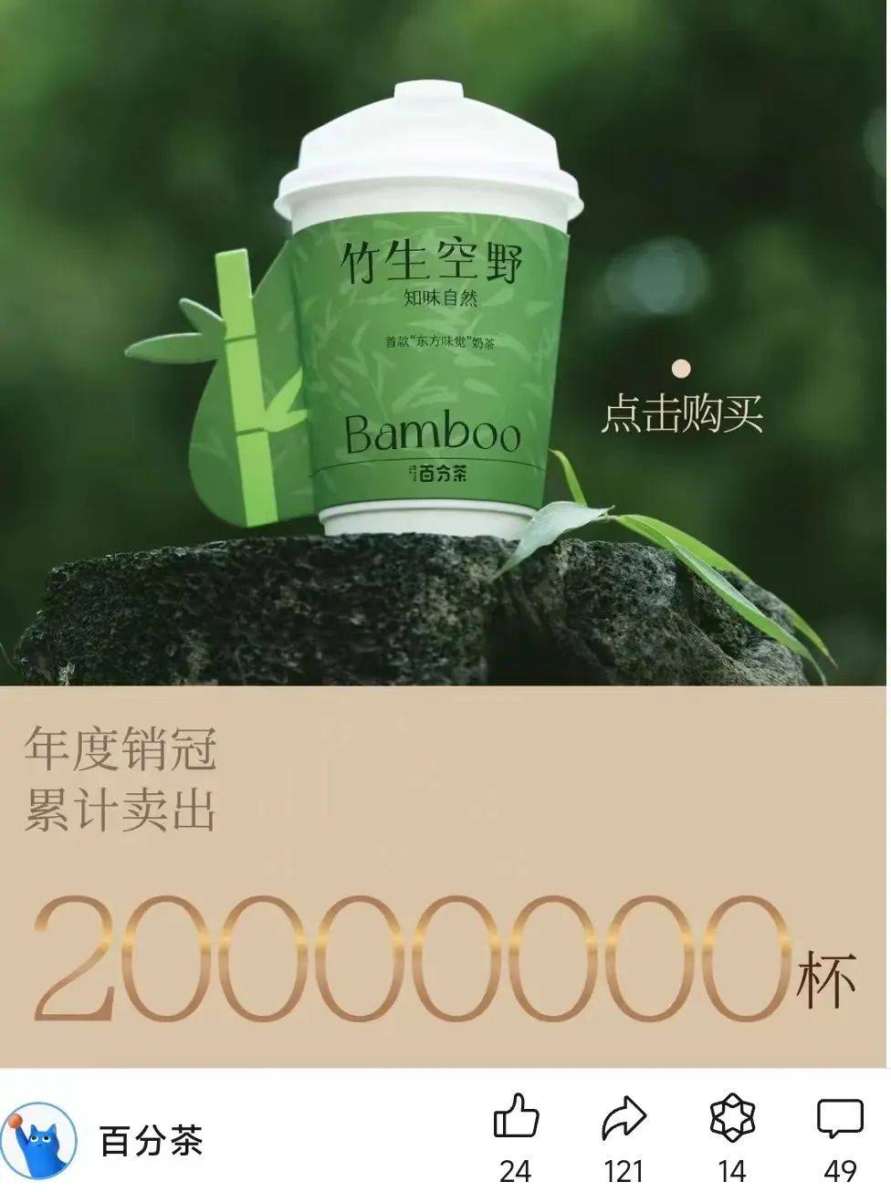 百分茶竹生空野年度销量2000万杯,图源来自官方公众号