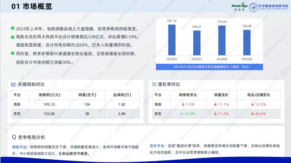 2025上半年,电商保健品线上大盘稳健发展,但竞争格局持续演变。淘系京东两大平台合计销售额328亿元 ,环比0.59% ,增速明显放缓,合计市场份额约占60%,已步入存量博弈阶段。