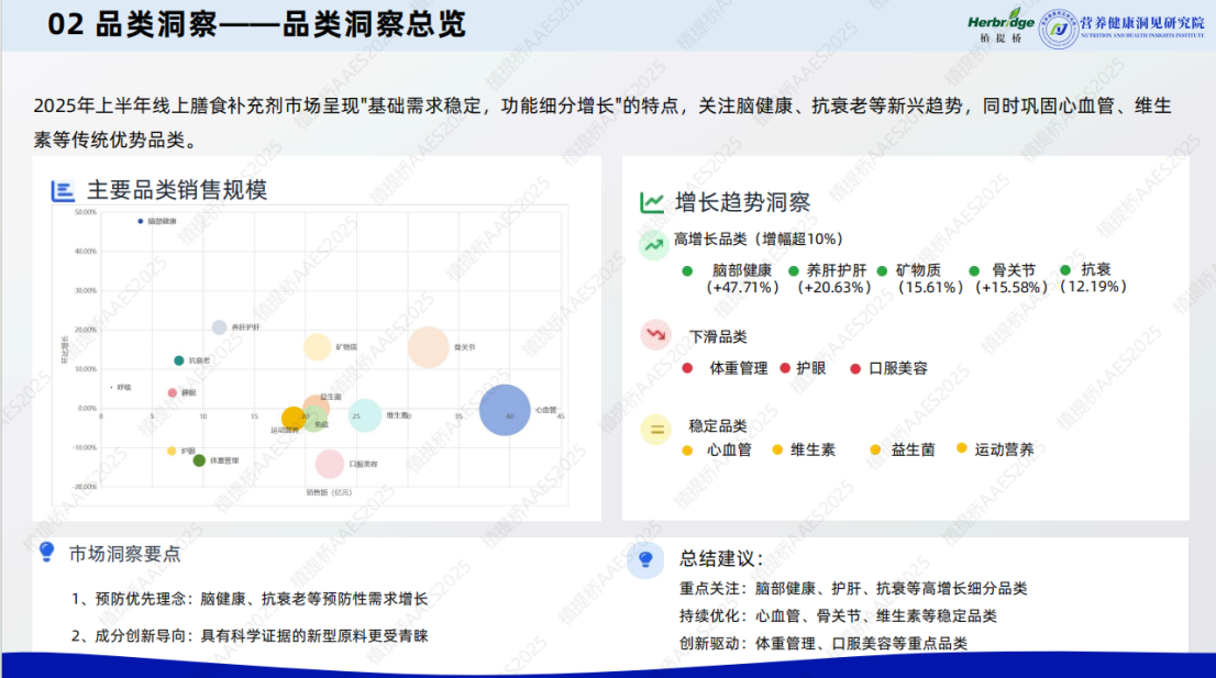 2025年上半年线上膳⻝补充剂市场呈现“基础需求稳定,功能细分增长”的特点。其中脑健康、肝脏健康、抗衰等5大细分品类增长率均超10%,值得重点关注。心血管健康、骨关节健康、维生素等整体销售额占比高,且有一定增速的品类,需要企业持续巩固。对于略有下滑的体重管理、口服美容品类,企业需通过创新来驱动增长。