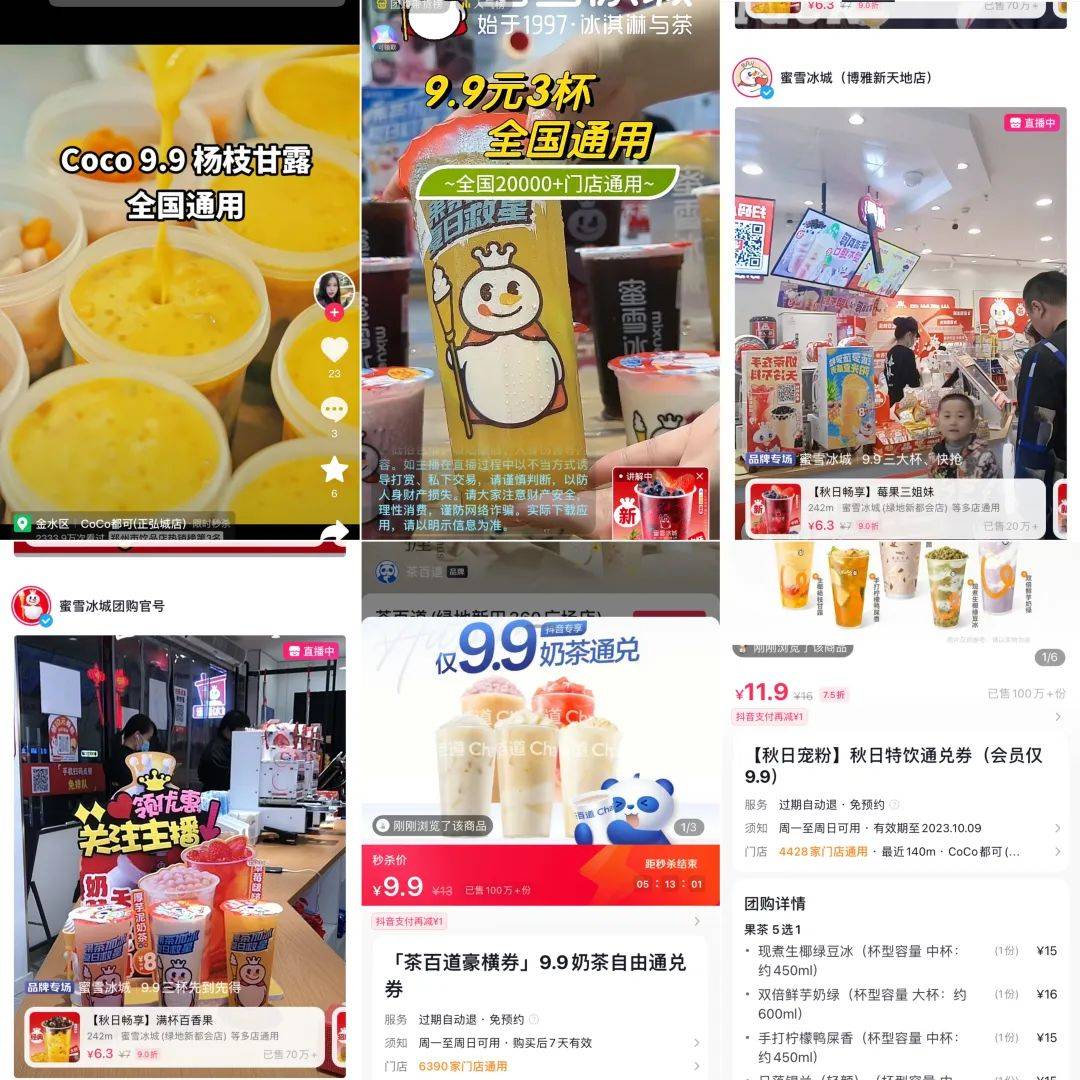 翻看短视频平台,蜜雪冰城的部分直播间,出现了“9.9元三杯”的特价优惠;CoCo都可的杨枝甘露,限时推出9.9元券;以及茶百道、古茗的部分直播间,也都出现过“9.9元券”。